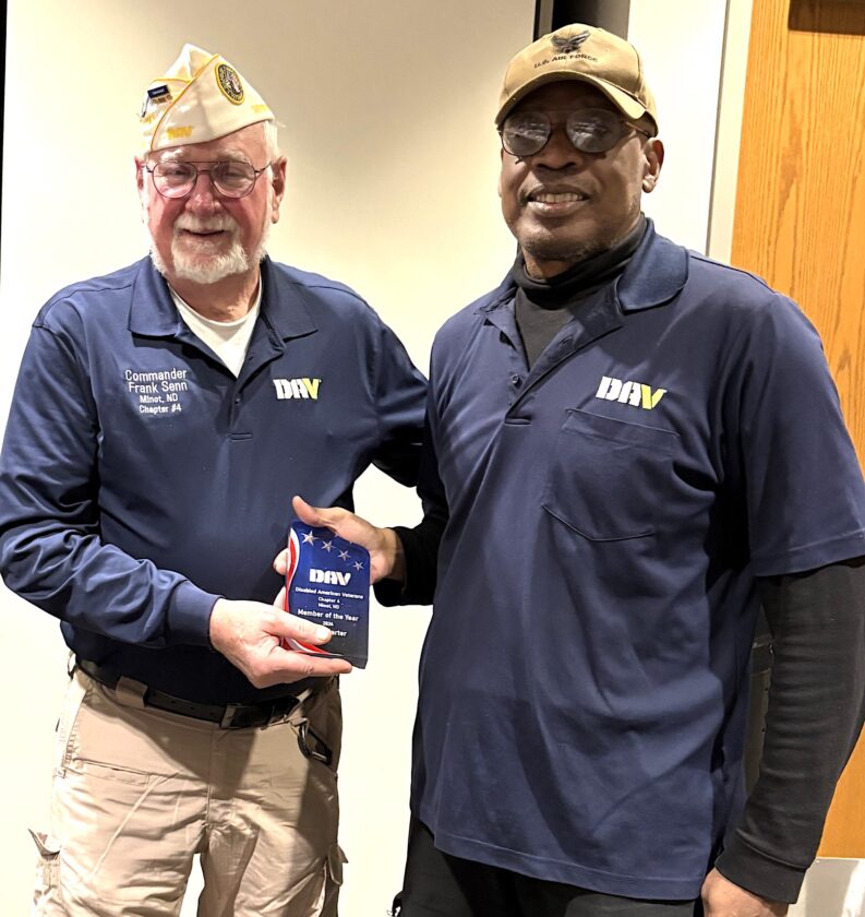 Submitted Photo Frank Senn, left, commander of the Disabled American Veterans Chapter 4, presented the chapter’s Member of the Year Award to Isaac Carter, junior vice commander, at the chapter’s Nov. 13 business meeting. Chapter 4 Coffees had 722 attendees last year, and Carter is credited as a key reason for the growing attendance. According to chapter information, in addition to his duties as junior vice commander, Carter has done an outstanding job as acting sergeant-at-arms for an extended period in the absence of a member who traveled out of state with his wife, who was undergoing a major medical event. Carter is also chairman of the Chapter 4 fundraising committee. His cheerful and helpful attitude is a great asset to the chapter, according to information.