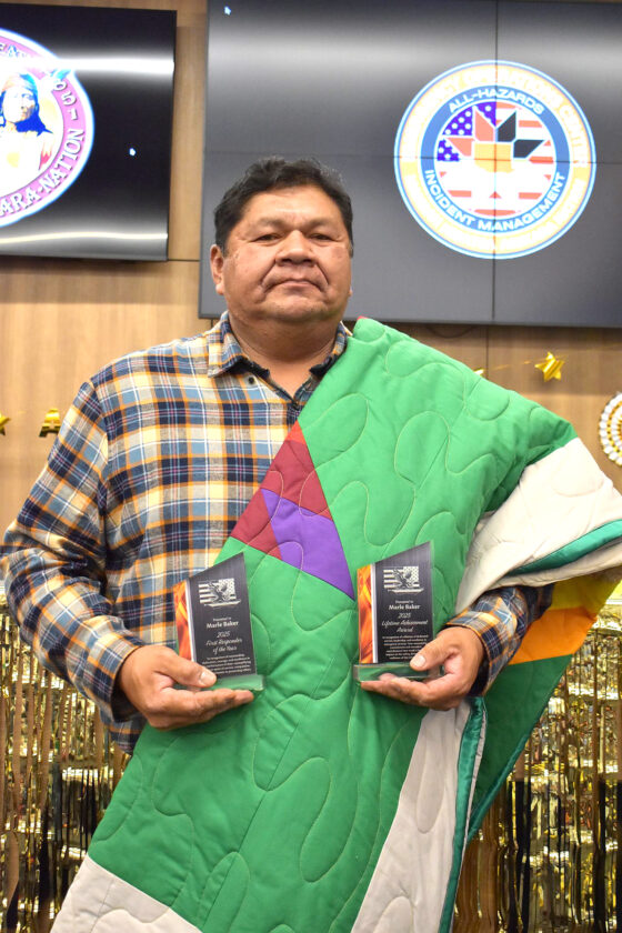 - Marle Baker, shown with a Star Quilt, was recognized as First Responder of the Year and also received the Lifetime Achievement Award at the Fort Berthold Indian Reservation Emergency Services Appreciation Day in New Town. Photo by Micah Moore.