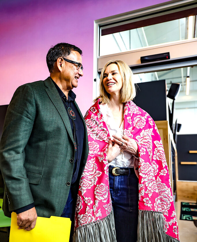 - Submitted Photo Mark Fox, left, chairman of the MHA Nation, is shown with Congresswoman Julie Fedorchak at the grand opening of the Native Green Grow greenhouse. Fedorchak was presented with an embroidered shawl. Photos by Karen LoneFight.