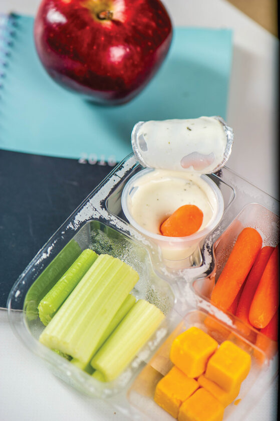 Any veggie will help us meet the 2 ½-cup daily recommendation for most people. Baby carrots, cherry tomatoes, cauliflower or broccoli florets or bell pepper strips provide crunch.