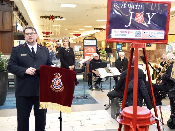 Lt. Trevor Reed with the Salvation Army in Minot speaks at the Red Kettle Campaign kick-off in Dakota Square Mall Saturday, Nov. 15. Members of the Kiwanis Band, behind Reed, performed at the event.