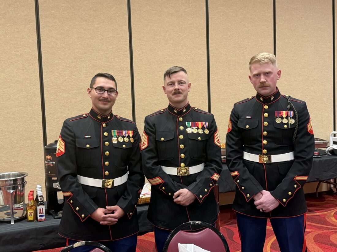 Recruiters with the Marine Corps Recruiting Station in Minot were among those attending the U.S. Marine Corps birthday celebration and dinner at 4 Bears Casino Monday, Nov. 20. From the left are Sgt. Marcus Schrimshaw, Staff Sgt. Christopher Harr and Cpl. Jackson Hill.