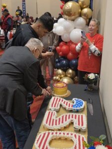 - Lee Barta, left, the oldest Marine, and Virgil John Hall, second from left, the youngest Marine attending the U.S. Marine Corps birthday celebration and dinner, are shown by the cakes made in commemoration of the event.