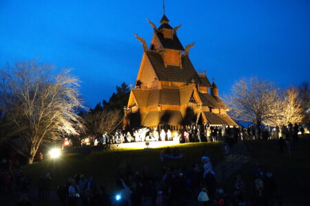 Lights glow around the Stave Church in the Scandinavian Heritage Park as a crowd gathers for the festivities celebrating the flipping of the switch to turn on the decorative lights for the first time this holiday season Saturday, Nov. 22.