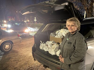 Joni Anderson, McHenry County Food Pantry coordinator from Granville, joined the group for the giveaway. She brought bags full of staple pantry items to hand out.