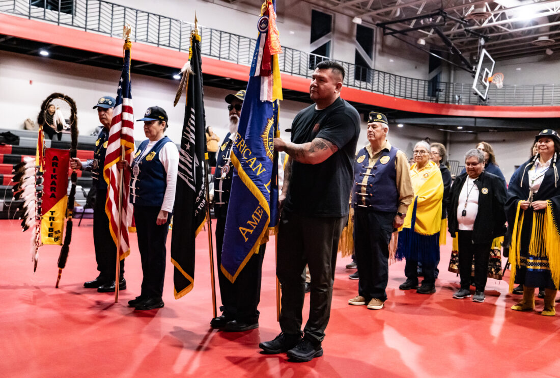 - Fred Fox, U.S. Navy veteran and White Shield East Segment councilman, addresses the audience at the Veterans Day Powwow held in White Shield the evening of Tuesday, Nov. 11. Fox played a special flute song over the drums. A Veterans Day program was held in the morning. Photo by Karen LoneFight.