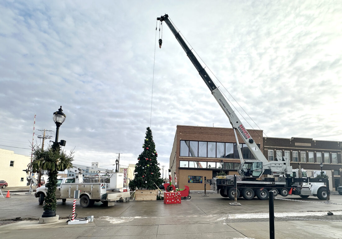 Work crews re-raise the downtown Minot Christmas Tree Wednesday morning, Dec. 17, after it toppled over in high winds Tuesday, Dec. 16. Charles Crane/MDN