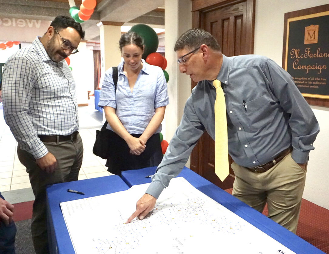 Tim Barlow, right, with the U.S. Air Force, provides information on missile silo sites to Jason Hirshberg and Molly Woods, both Minot, at a Sentinel town hall in Minot Aug. 26.