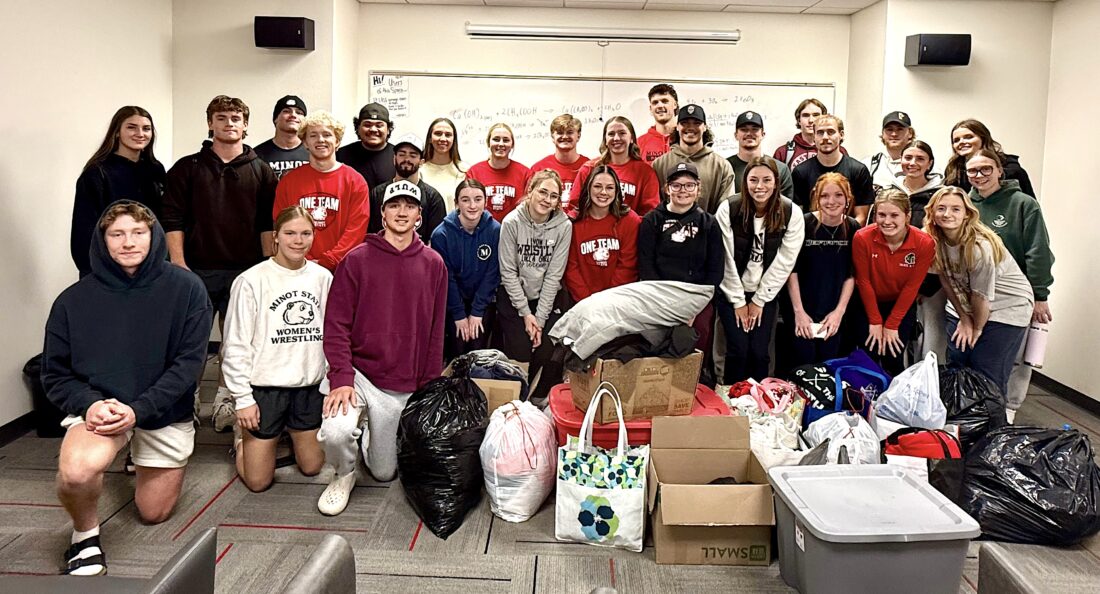 A month-long winter clothing and food drive led by the Minot State University Student-Athlete Advisory Committee (SAAC) brought in record donations for the Domestic Violence Crisis Center (DVCC) in October, filling a minivan with bags and bins gathered from every athletic team.