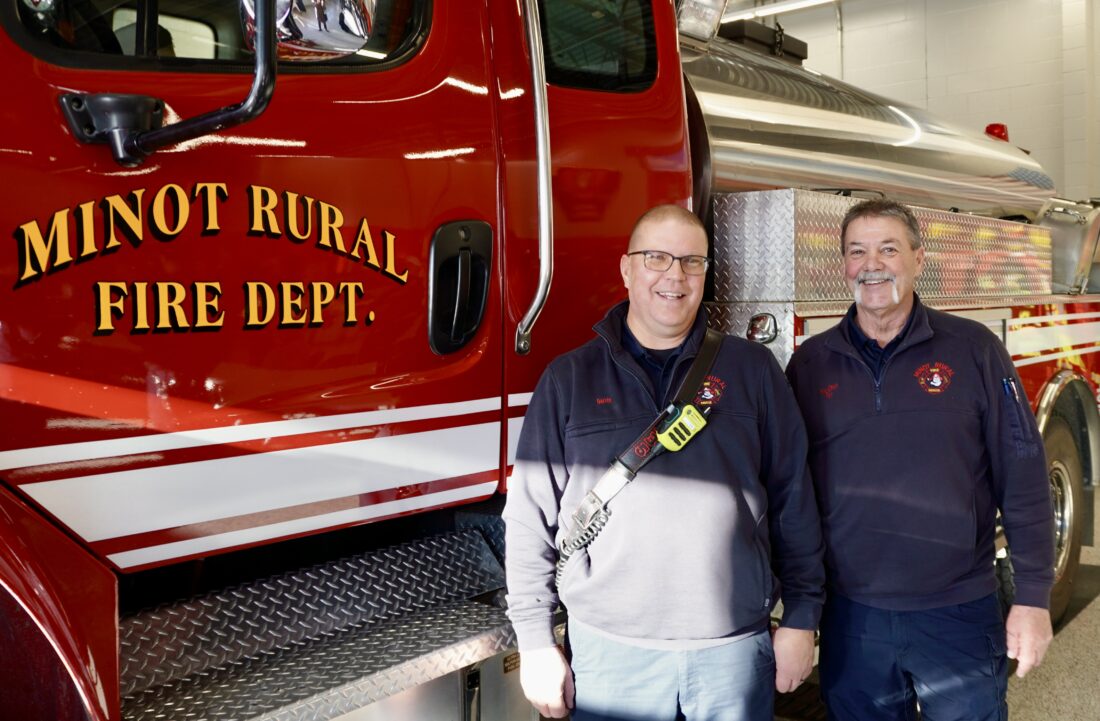 - Jill Schramm/MDN Darrin Mineke, left, incoming fire chief at Minot Rural Fire Department, and Rex Weltikol, outgoing chief, stand next to one of the department’s fire trucks Friday, Dec. 19.