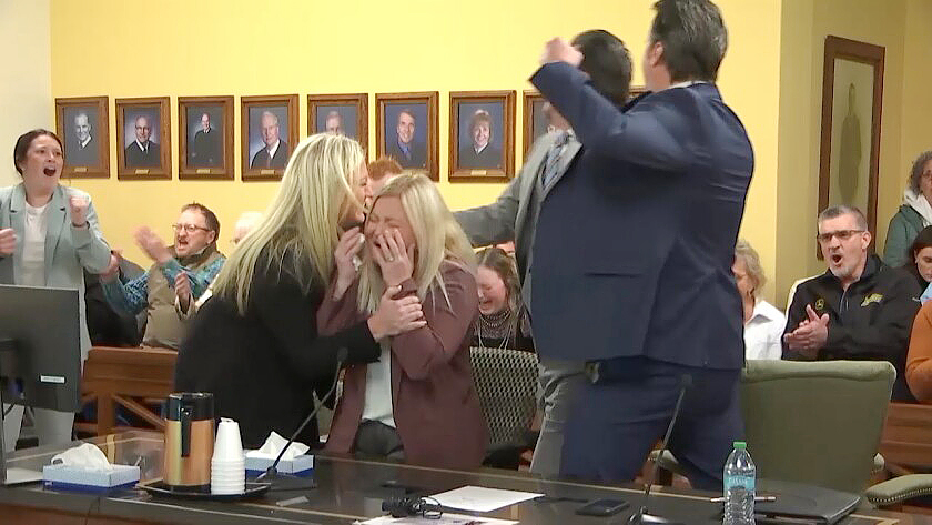 Nichole Rice, center, and her legal team react to the not guilty verdict from the jury in the trial for the murder of Anita Knutson in 2007 in Grand Forks on March 26.