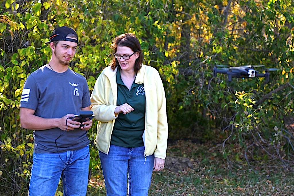 Submitted Photo Dr. Linda Burbidge, right, works with a former student during a hands-on drone training exercise at Dakota College of Bottineau.