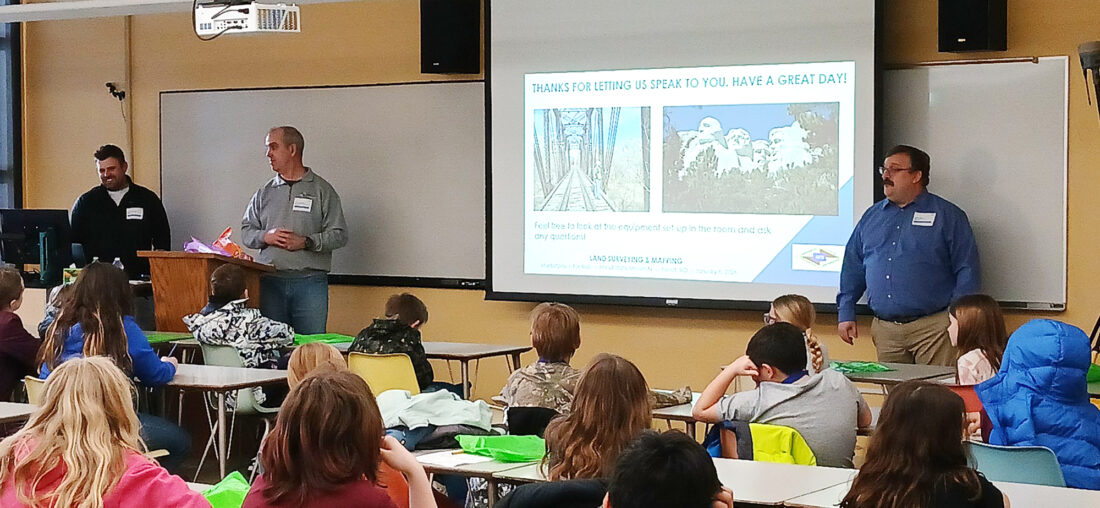 Wendy Harper/MDN Tom Lambrecht of AE2S, left, Tom Leshovsky of Wold Engineering and Jason Main of Ackerman Surveying instruct students in land surveying and mapping at Education Day presented by Marketplace for Kids, Tuesday, Jan. 6, at Minot State University.