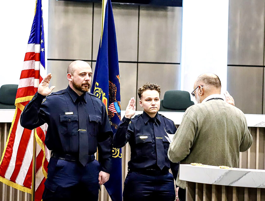 Submitted Photo Gregory McGraw, left, and Madison Lehner are sworn in by Minot Mayor Mark Jantzer on Wednesday, Jan. 21, as the newest members of the Minot Police Department. Deputy Chief Dale Plessas pinned the new officers. According to the department, both officers bring prior law enforcement experience and have completed in-house training. They next will complete the Field Training Officer program. Photo from the City of Minot.