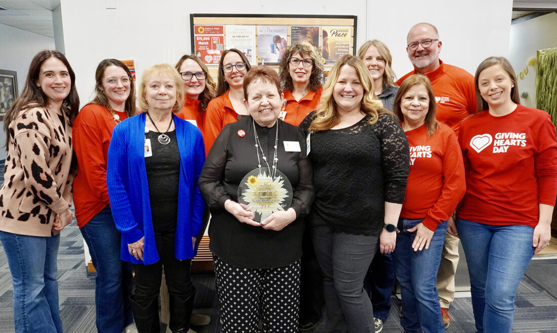 Jill Schramm/MDN Nadia Smetana, holding her plaque, was honored Friday, Feb. 6, at a retirement party at Dakota Hope Clinic, where she has served as executive director. She was instrumental in the founding of the clinic that started in Minot in 2013 and now has satellite offices in Tioga and Bottineau. Clinic staff members, from left, are: front, Janis Neumann, Smetana, Karmen Hanson, Deborah Leier, Emily Rann, and back, Kira Eull, Caitlin Arnold, Mandy Crocker, Stacey Scott, Tanya Humphreys, Kristi Fannik and Tim Knutson. Crocker has been named the clinic’s new executive director. Not pictured is Bonnie Engel of the Bottineau satellite clinic.