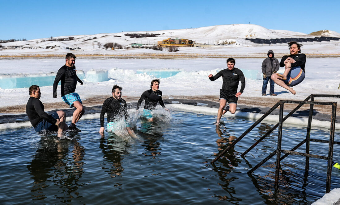 A threesome from Chord Energy leap into Lake Sakakawea, west of New Town, for MHA Nation’s 10th annual Ice Warrior Plunge Monday, Feb. 23. Photo by Karen LoneFight