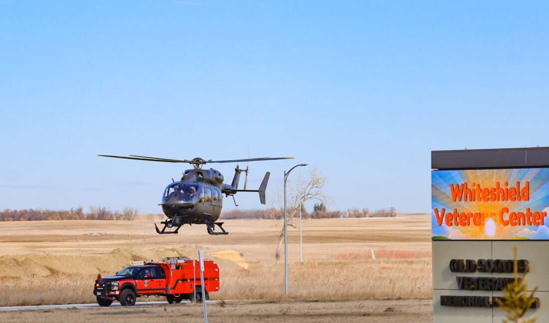 - Submitted Photo A helicopter from the North Dakota National Guard landed in a “hot landing zone” set up near the White Shield Veterans Center. Photo by Karen LoneFight.