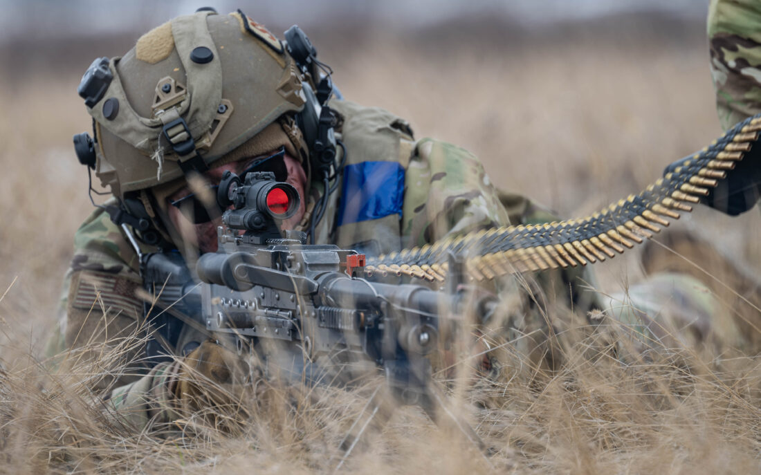 U.S. Air Force Airman 1st Class Ayden Kozlowsky, 91st Missile Security Operations Squadron convoy team member, fires an M240B machine gun during a force-on-force exercise at Garrison Feb. 6. Kozlowsky provided suppressing fire for his team to facilitate their movement during the exercise. U.S. Air Force photo by Senior Airman Kyle Wilson.