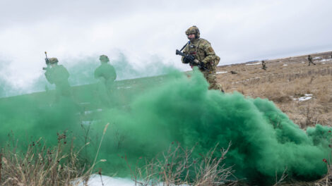 U.S. Air Forice airmen assigned to the 91st Missile Security Operations Squadron assault a simulated opposing force during a force-on-force exercise at Garrison Feb. 6. The airmen used a smoke grenade to conceal their movement and positioning. U.S. Air Force photo by Senior Airman Kyle Wilson.