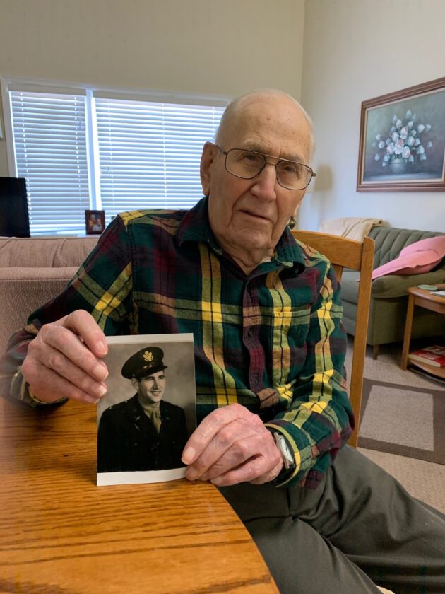 MDN File Photo Ray Curtis of Minot holds a photo of himself when he served in the U.S. Army. This photo was taken in 2021 when he celebrated his 104th birthday.