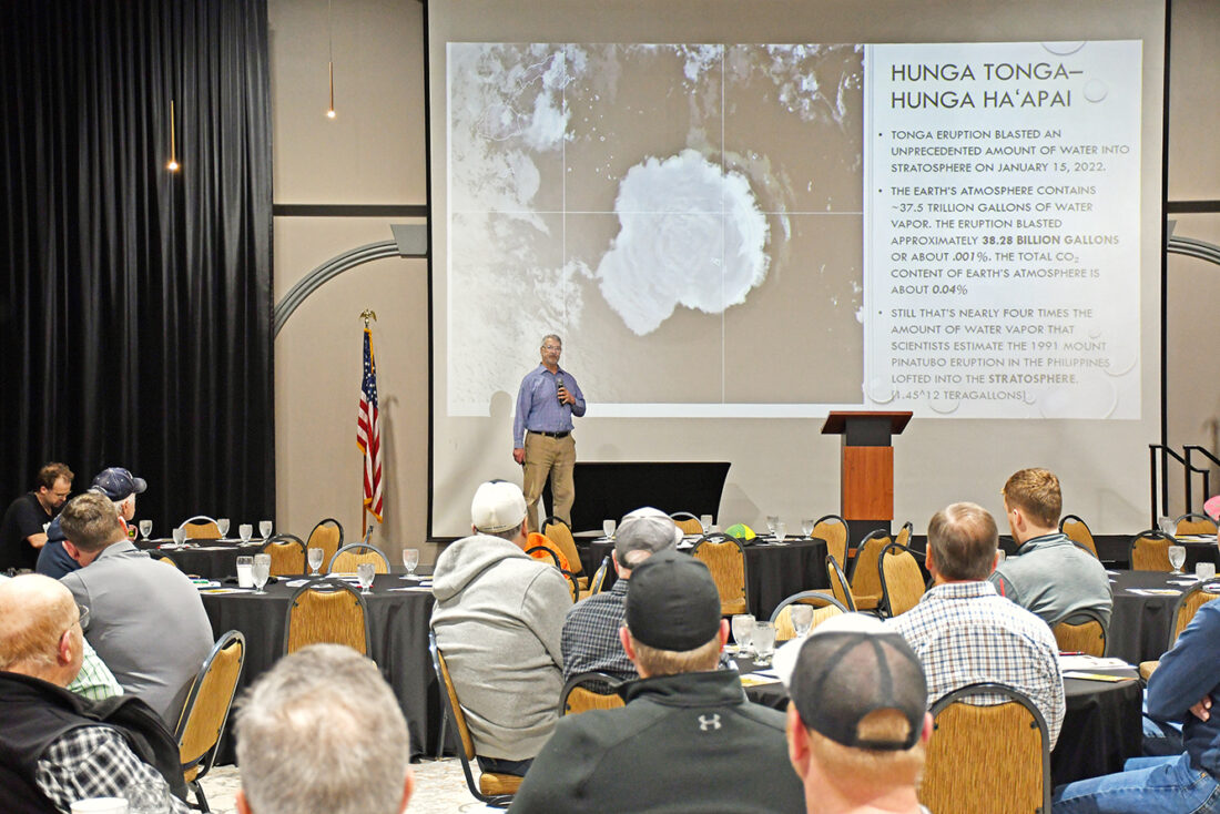 Submitted Photo Mark Ewens, a Grand Forks meteorologist, speaks about how the eruption of the submarine volcano Hunga Tonga-Hunga Ha’apai in the South Pacific ocean in January 2022 is still affecting the weather worldwide. The eruption blasted an unprecedented amount of water into the stratosphere on Jan.15, 2022, creating the largest atmospheric pressure wave ever recorded. Ewens spoke at the 73rd National Hard Spring Wheat Show in Williston Wednesday, Feb. 4. Other events at the wheat show were an appreciation breakfast, agricultural cost management workshop, awards lunch and speakers covering weed control and chemical updates, wheat disease, wheat breeding and crop market and trade outlook. Photo by Roger Riveland.