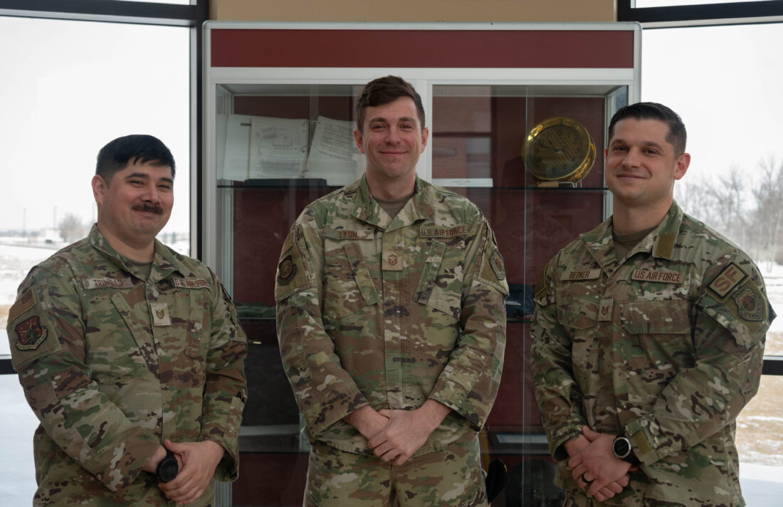Submitted Photo U.S. Air Force Tech. Sgt. Brandon Trinidad, 91st Security Forces Group chief of weapons and tactics, left, U.S. Air Force Master Sgt. Chad, 20th Air Force chief of weapons and tactics for ICBM security forces operations, middle, and U.S. Air Force Tech. Sgt. Aaron Bedker, 91st Missile Security Operations Squadron NCOIC weapons and tactics, pose for a photo during a Nuclear Security Operations Tactics, Techniques and Procedures rewrite at Minot Air Force Base Feb. 25. U.S. Air Force photo by Airman 1st Class Wesley Davies.