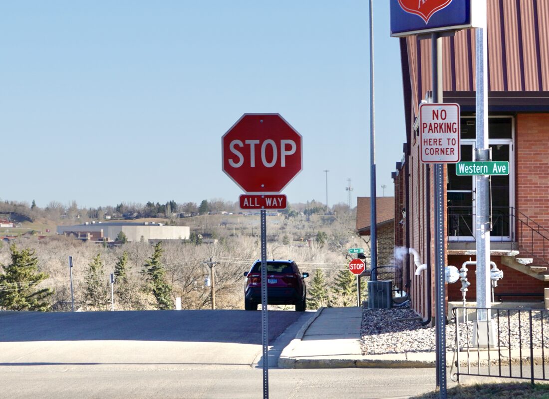 JILL SCHRAMM/MDN A short section of Fourth Street Southwest, shown from the stop sign at Western Avenue to the stop sign at Second Avenue, would become a one-way under a plan advanced by the Minot City Council April 20.