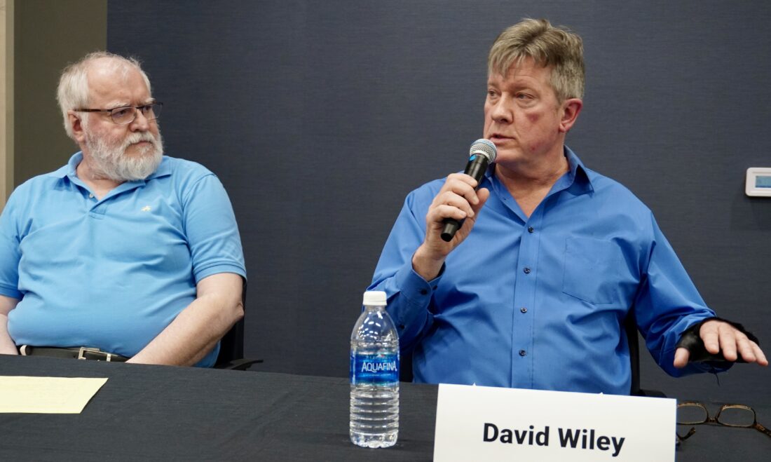 - David Wiley, right, tackles a question at a Minot City Council candidate forum Wednesday, April 15, as Stephan Podrygula listens at left.