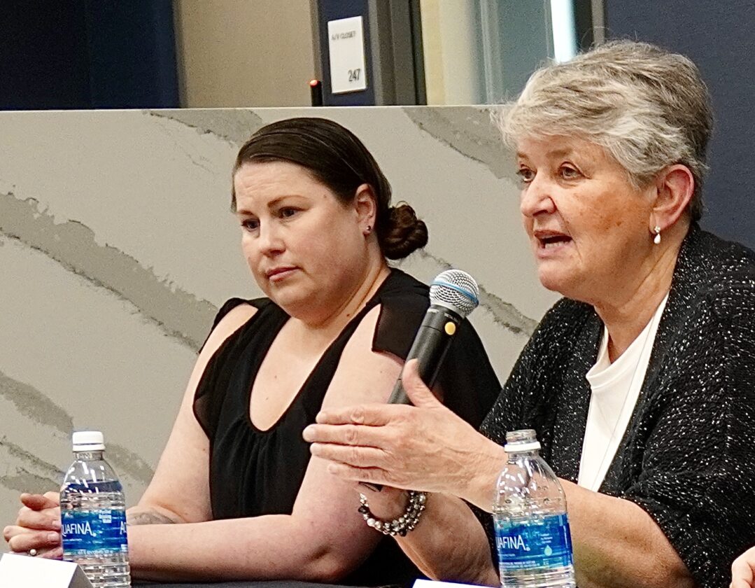 Joan Hawbaker, right, speaks at a Minot City Council candidate forum on Wednesday, April 15. At left is Nicole Brasfield.
