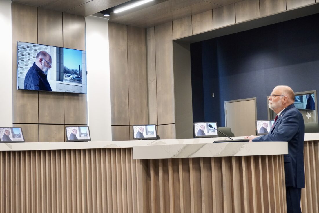 JILL SCHRAMM/MDN Mayor Mark Jantzer, right, watches a video that was incorporated into his State of the City address in Minot City Hall Monday, April 6. The video displayed on the council chambers’ large and small screens.