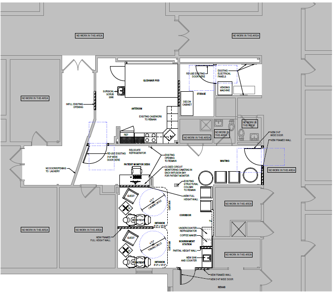 - Submitted Graphic A floor plan for the new oncology space shows two infusion units on the lower portion of the drawing, which will have closed circuit cameras for observation. A waiting area is located on the lower right wing, with storage and other services on the upper right wing. The remaining space is largely employee work area.