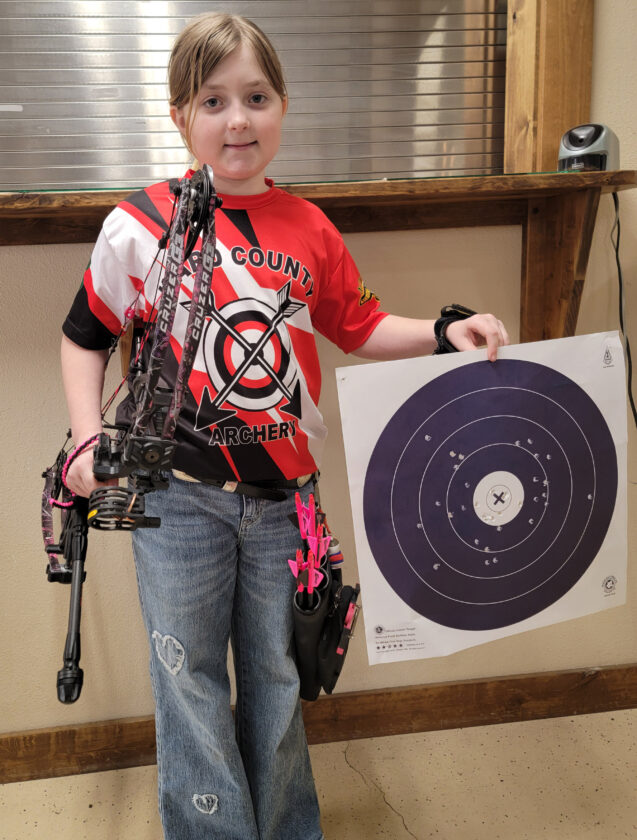 Submitted Photo Ward County 4-H archer Claire Babinchak holds her target after competing in Beginner Freestyle.