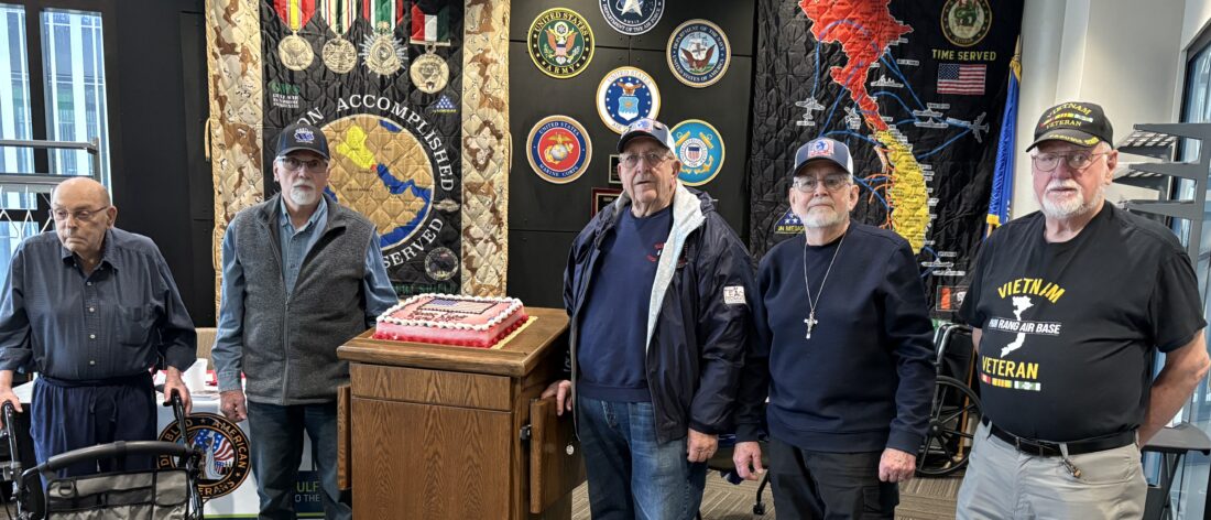 Submitted Photo Four Minot-area veterans were recognized during the DAV Chapter 4 Coffee Social on Wednesday, April 15, From left to right are Robert Knutson (Army), Lyle Torno (Army), William Niemann (Air Force), Robert Lowe (Air Force and National Guard) and DAV Chapter 4 Commander Frank Senn. Senn honored the four as they prepare to travel on the Western North Dakota Honor Flight, departing Bismarck on April 26 and returning the evening of April 27. This marks the organization’s ninth trip to Washington, D.C., which includes visits to the World War II, Korean War and Vietnam memorials, as well as Arlington National Cemetery.