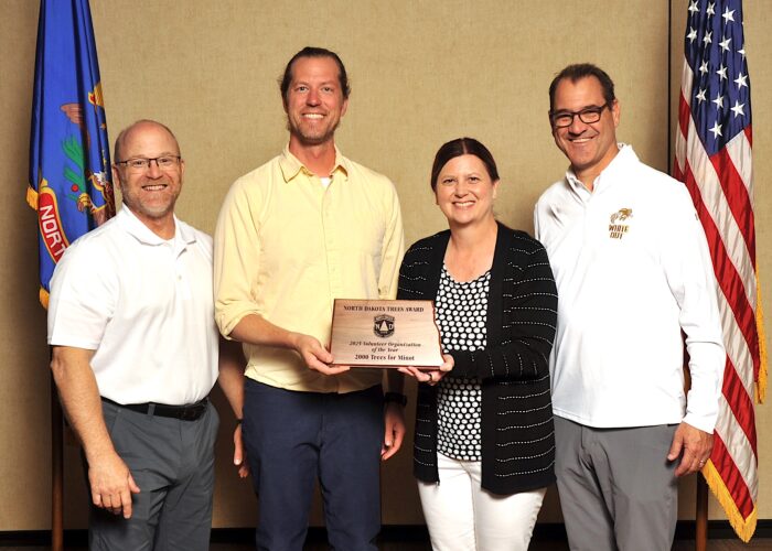 2000 Trees for Minot was awarded the 2025 “Volunteer Organization of the Year” Trees Award at the Trees Bowl and awards ceremony held in Fargo on Saturday, Sept. 13. Tim Baumann and Donna Bye were present to accept the award.