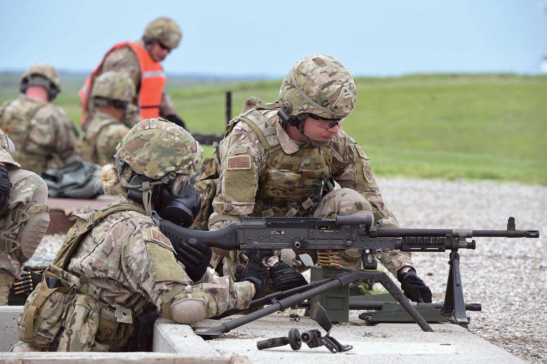 Senior Airman Noelle Kurowski of the 219th Security Forces Squadron prepares to fire an M240B machine gun while wearing a gas mask at the firing range at Camp Gilbert C. Grafton South on July 12, 2018, shown in this photo by Senior Master Sgt. David H. Lipp. The airman is performing annual weapons familiarization training and qualification for the assigned mission of missile field security at Minot Air Force Base.