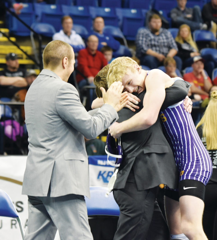 Garrick Hodge/MDN Bishop Ryan's Konner Beeter jumps into the arms of his coach in celebration after winning the 152-pound state title match.