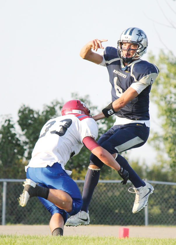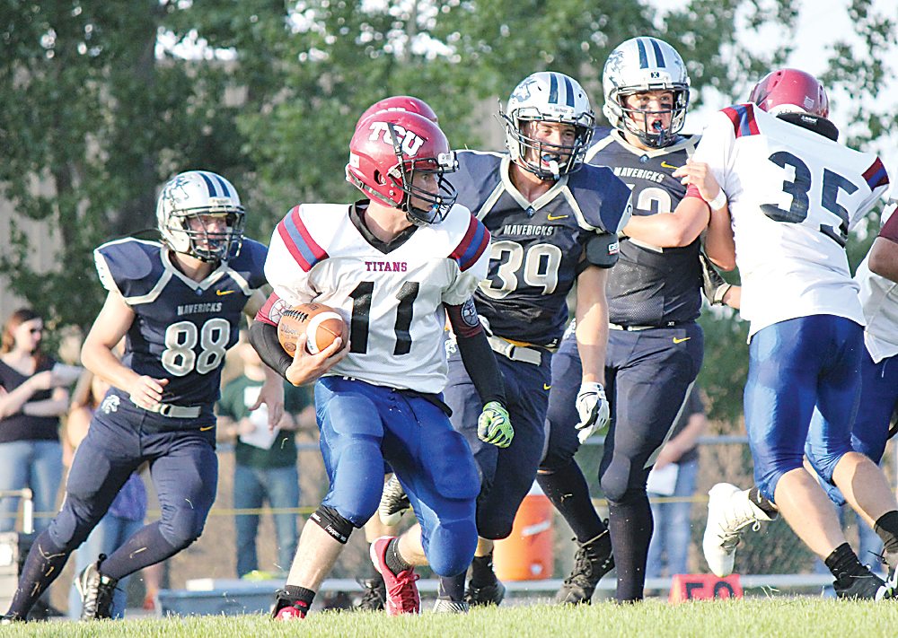 MOHALL – Whenever an impact play was needed, the ball always seemed to end up in the hands of Mohall-Lansford-Sherwood junior Isaac Undlin. Running, catching and throwing, Undlin was everywhere Friday in helping the MLS Mavericks win its season-opener over the Towner-Granville-Upham Titans, 42-6.