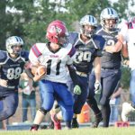 - Alex Eisen/MDN TGU quarterback Jared Lovro (11) runs out of the pocket Friday against the MLS Mavericks in a 9-man football game played in Mohall.
