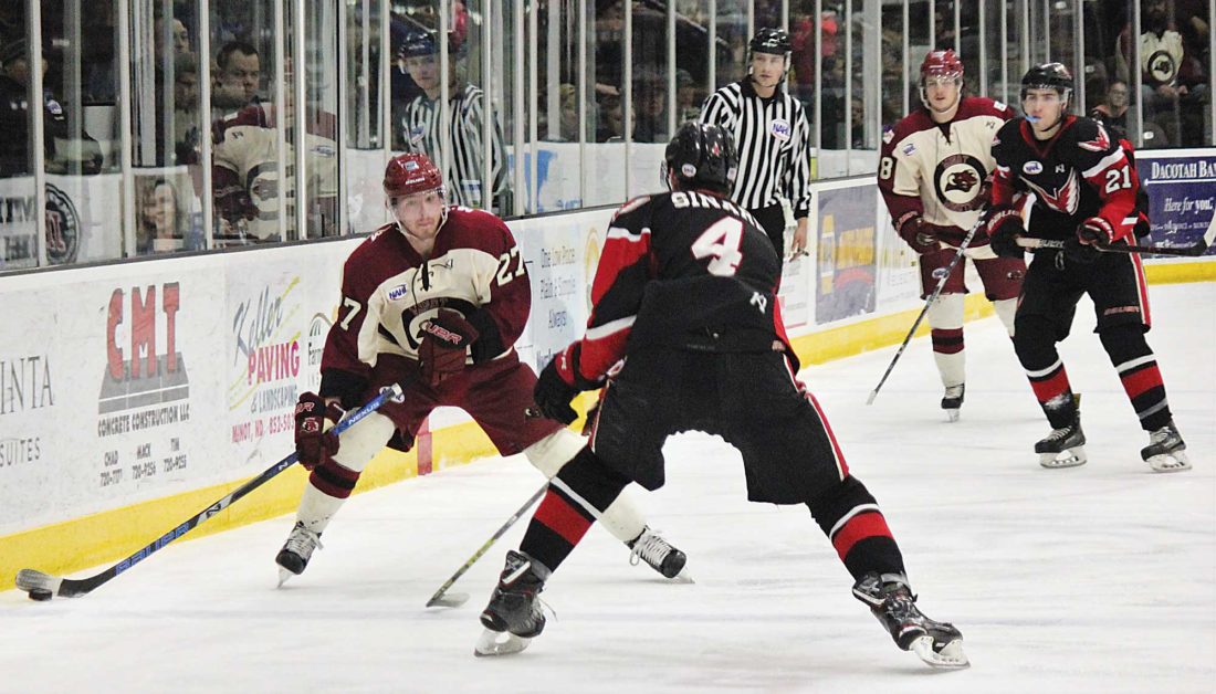 - Alex Eisen/MDN Minotauros forward Ryan Green (27) tries to skate around Aberdeen Wings defender Andrew Sinard (4) in an NAHL game played last weekend at Maysa Arena.