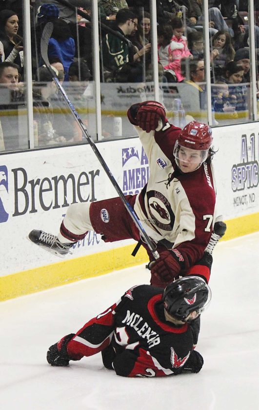 - Alex Eisen/MDN Tauros defenseman Jake Rosenbaum (7) levels Wings forward Joey Molenaar (21) with a body check Friday in Minot.