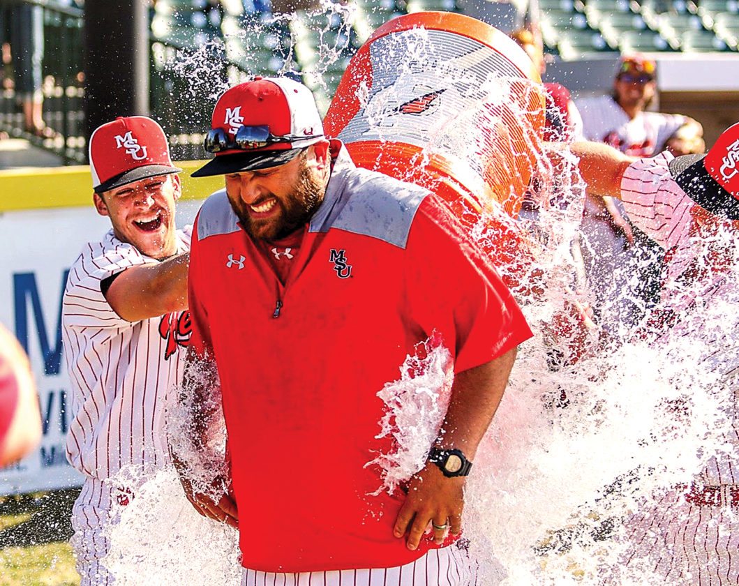 Sean Arbaut/Minot State athletics Minot State baseball coach Scott Eul gets a celebratory water bath after clinching the NSIC title Saturday.