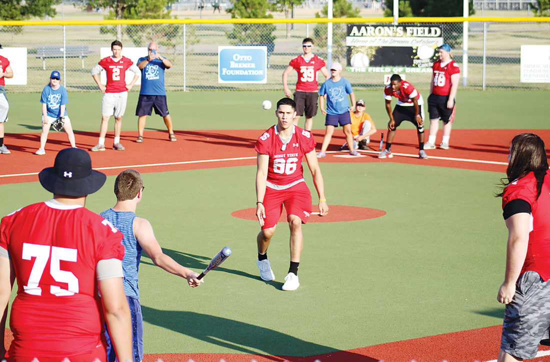 - Ashton Gerard/MDN Members of the Minot State University football team visited Aaron’s Field Thursday to play baseball with the Dream Catchers. The Dream Catchers organization offers children with mental or physical impairment the opportunity to play baseball. MSU players helped the Dream Catchers in the field and helped them around the bases during their games.