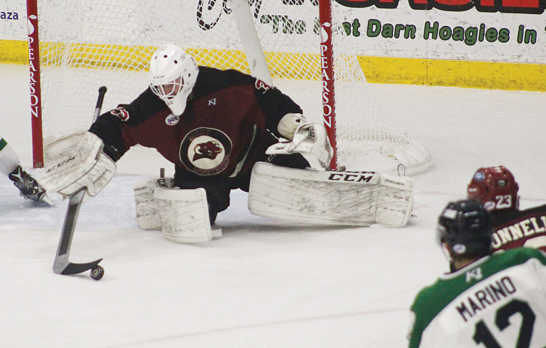 Alex Eisen/MDN Minotauros goaltender Ben Garrity saves a shot in the first period Friday evening against the Brookings Blizzard. Garrity was pulled in the second period, and Minot lost 7-2 at Maysa Arena. It's the largest defeat so far this season for the Minotauros and it snapped a three-game winning streak.
