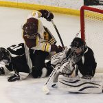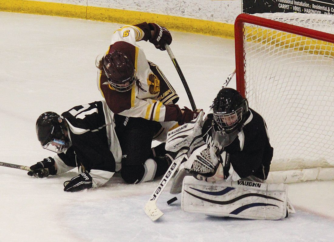 At the other end of the ice, MHS sophomore goaltender Amber Borkhuis was doing everything to keep the puck out. She made three point-blank saves in the first three minutes, then got a little creative.