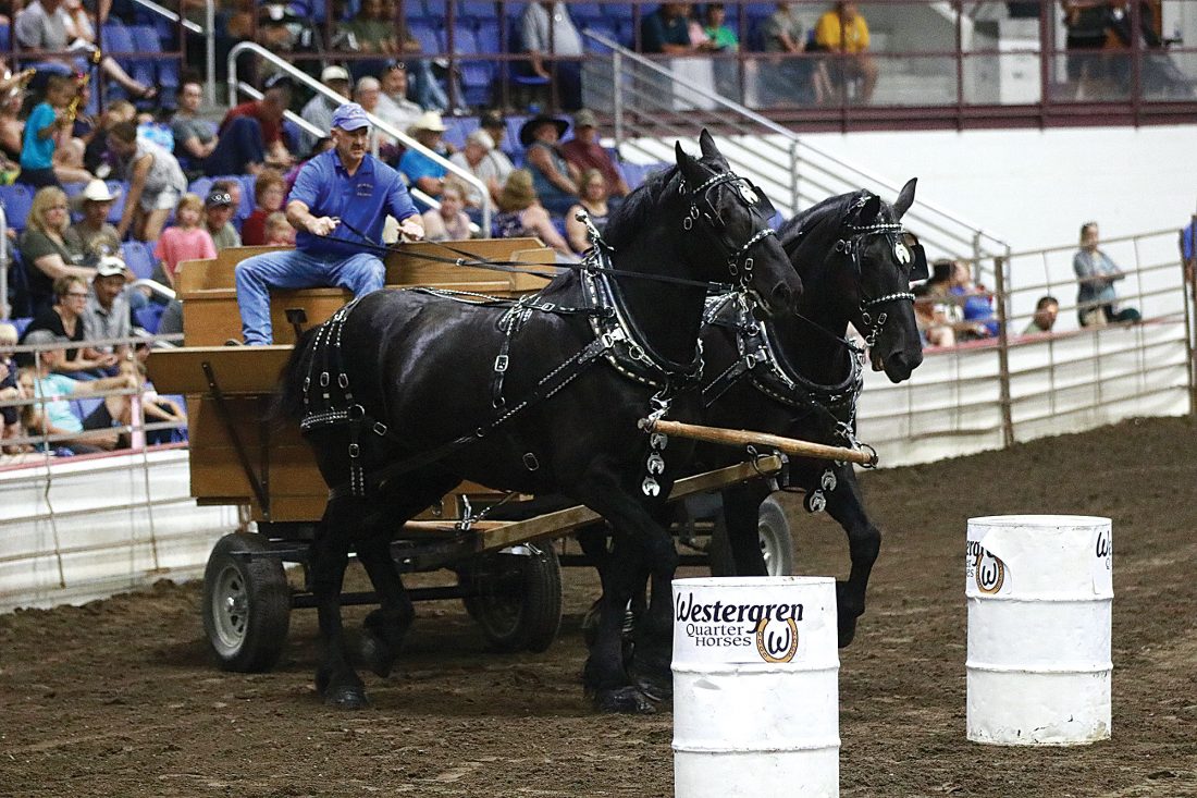 Horses weave their way through barrels at the Obstacle Course at All Seasons Arena. Participants also competed in Cloverleaf and Log Skidding events as part of the Draft Horse Team Events.