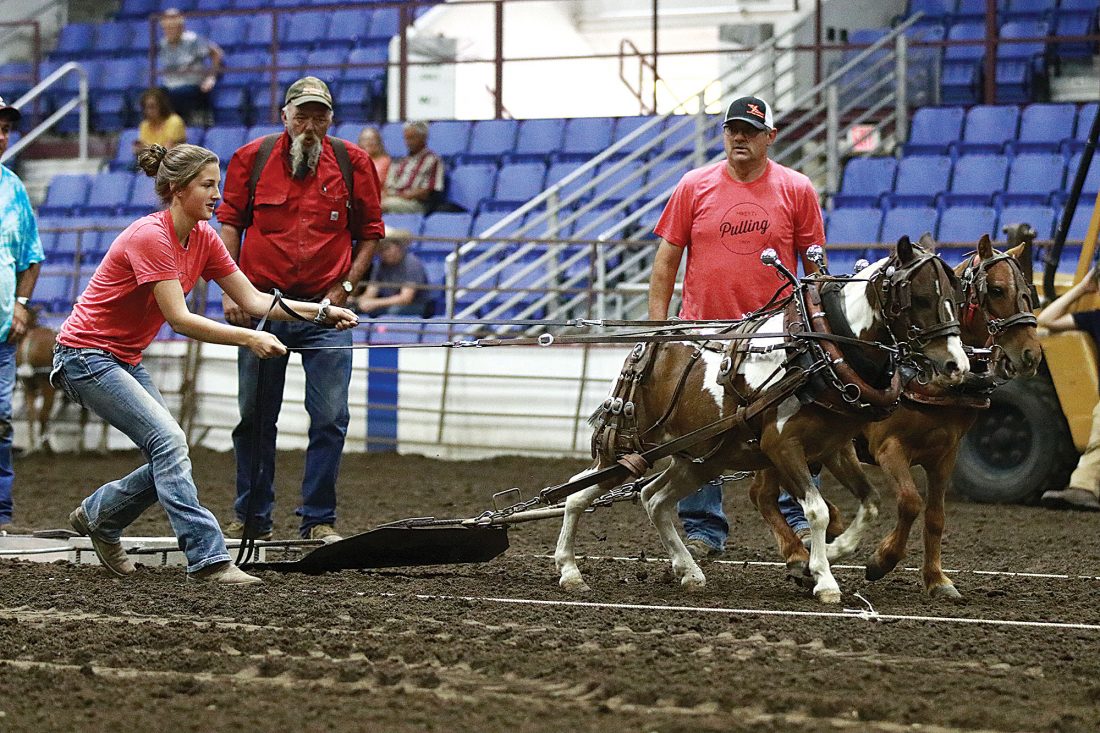 Emma Bock pulls ponies Rock and Berry at the 2019 Pony Pull. Seven teams participated in the event at All Seasons Arena.