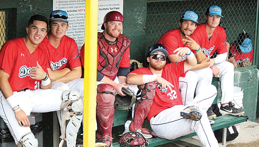 Alex Eisen/MDN A group of Sabre Dogs passing the time in the dugout during Thursday's weather delay at Corbett Field.