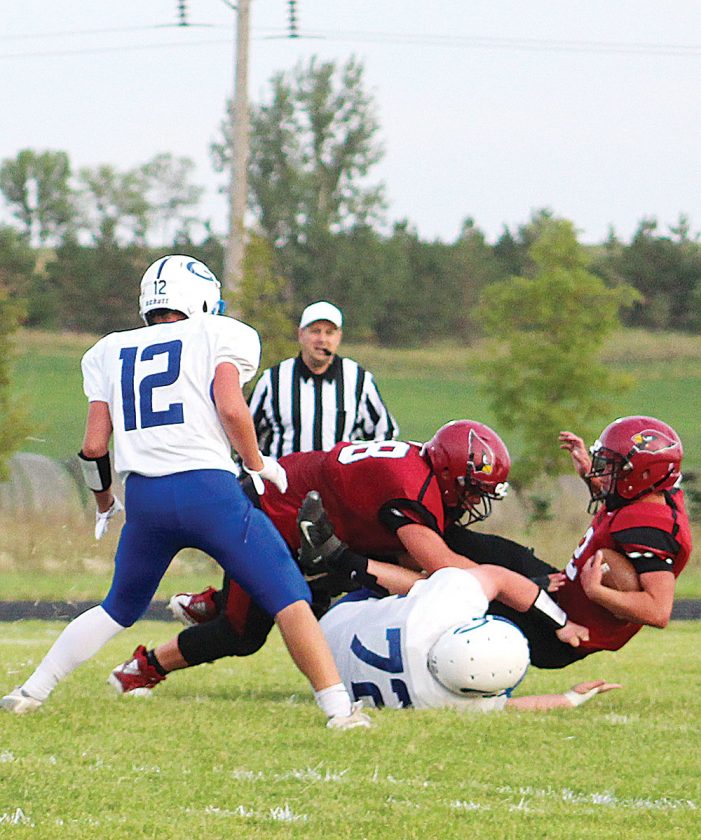 Ashley Sablan/MDN Troopers lineman Nicholas Hodges (72) brings down a Nedrose Cardinal during a high school football game Friday at Nedrose. The Troopers defeated the Cardinals 40-32.