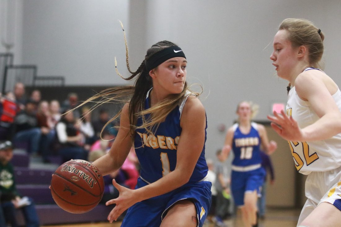 Jimmy Lafakis/MDN Trenton senior guard Kaity Hove (1) looks past Velva freshman forward Olivia Passa (32) in the first half of Saturday’s game in Berthold. The Tigers earned a 59-34 victory over the Aggies.