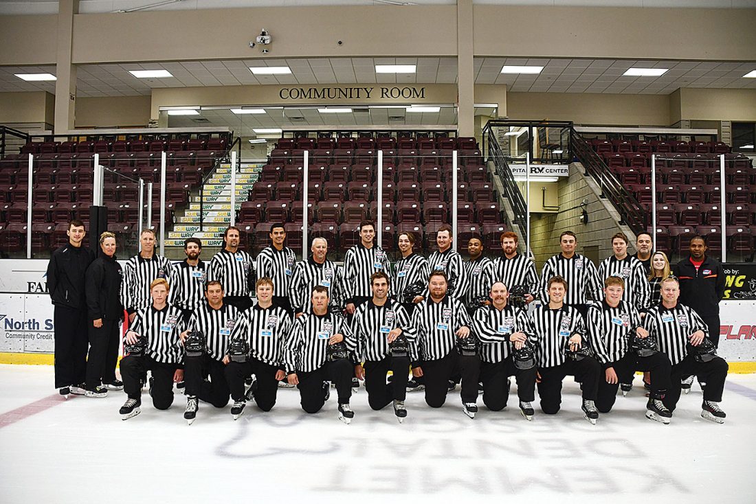 Robert Brewer/MDN This past weekend, the Maysa Arena in Minot played host to an officiating seminar organized by the Northern Plains District. The goal of the seminar was to help prepare experienced hockey referees for an opportunity to officiate at an even higher level of competition. Participants of the seminar came from various regions across the Midwest. Front row left to right: Reece McIntosh (Mont.), Geno Palazzari (Wyo.), Nigel Schmitz (N.D.), Nathan Medler (N.D.), Jordan Kelly (N.D.), Luke Charbonneau (Minn.), Duncan Browne (N.D.), Eric Steele (N.D.), Cooper Strand (N.D.), Chris Lee (Mont.) Back row left to right: Casey Caywood (Mont.), Alicia Hanrahan (Minn.), Michael McIntosh (Mont.), Devin Blada (N.D.), Mark Neset (N.D.), Kyle Stephens (N.D.), Chad Love (N.D.), Holden Kurtz (N.D.), Dale Kjorstad (N.D.), Westin Davies (Mont.), Sam Smith (N.D.), Taran Albright (N.D.), Odin Nelson (N.D.), Alec Larson (Minn.), Thor Nelson (N.D.), Mary Belzer (N.D.), Gui Bradshaw (Ohio).